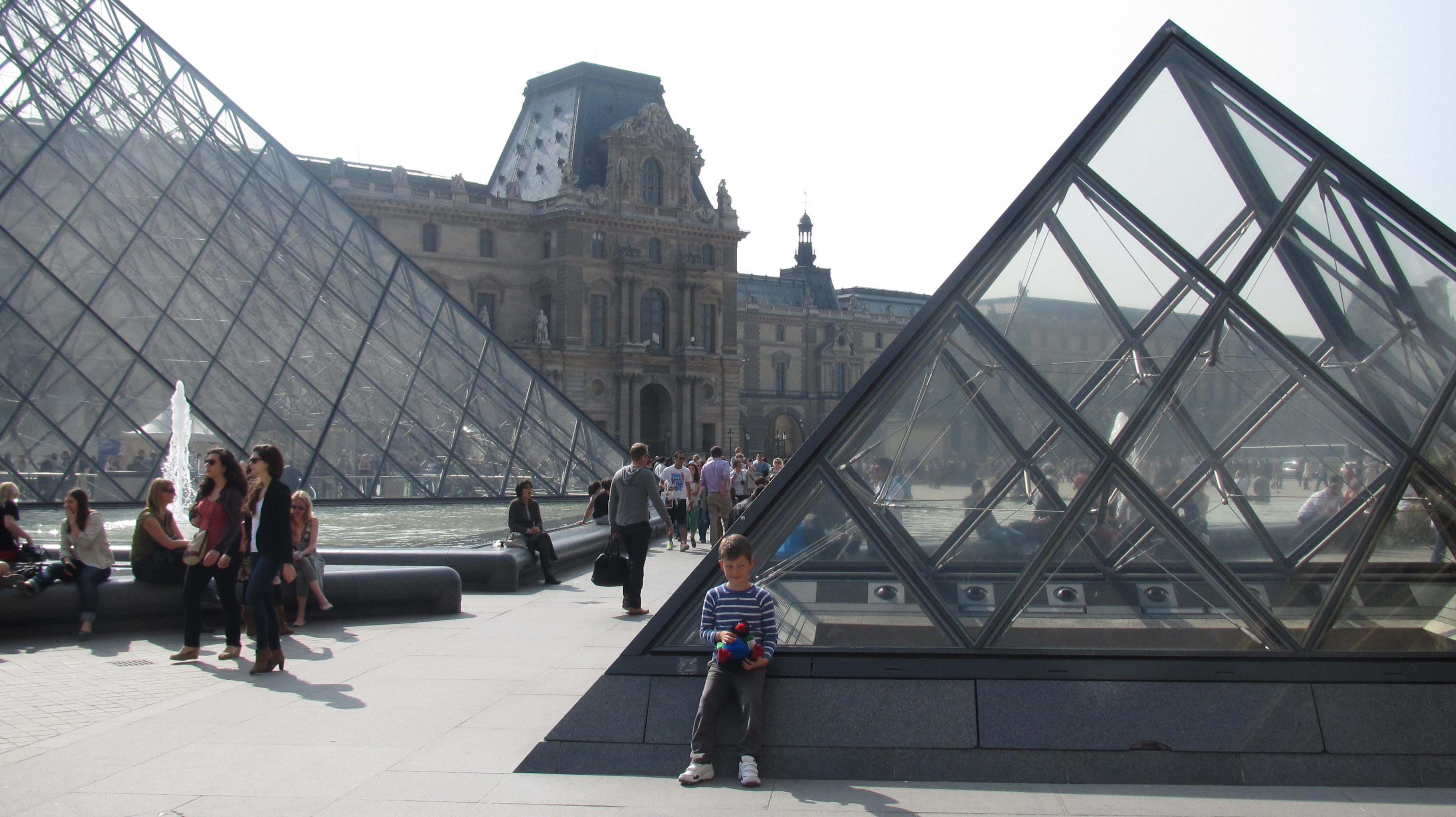 We left our bags at the hotel, and we walked to the Louvre, which is a famous art museum, and home of the Mona Lisa painting, which was painted by Leonardo Da Vinci, who was a very famous painter from 500 years ago. There were some glass pyramids in the courtyard outside. When you looked down through the pyramids you could see the inside of the Louvre.