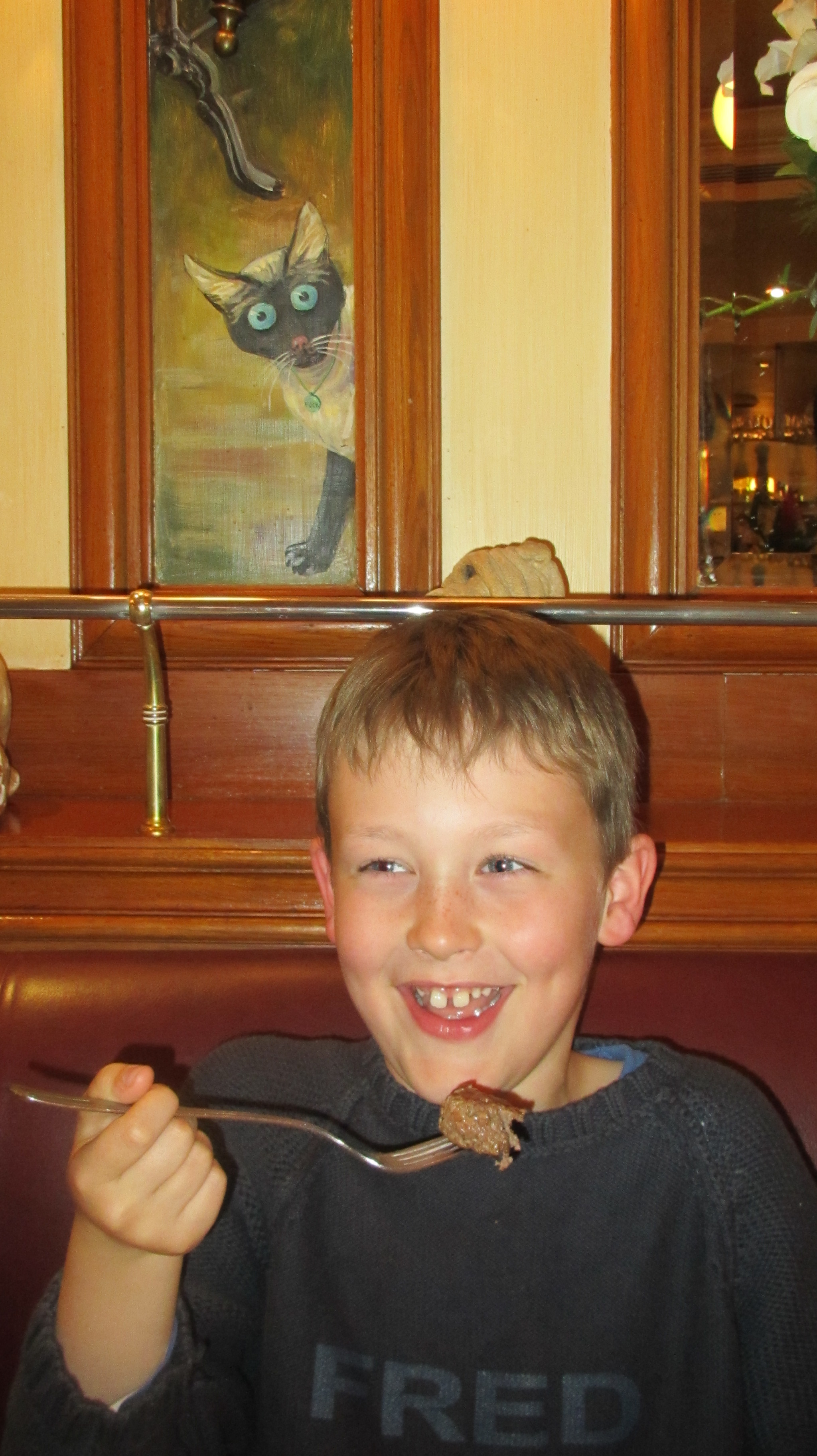 We had dinner at this restaurant which had lots of pictures of dogs. It is called Au Chien qui Fume. Where I was sitting was in front of the only cat picture in the whole restaurant!